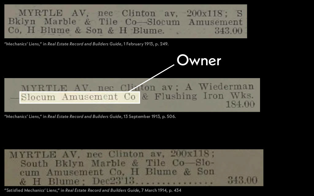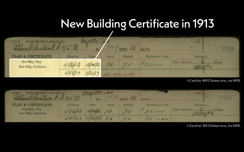 Newspapers, the weekly Real Estate Record, New Building certificates, and property I-cards were consulted in an attempt to determine each building's construction date, original owner or developer, and architect.