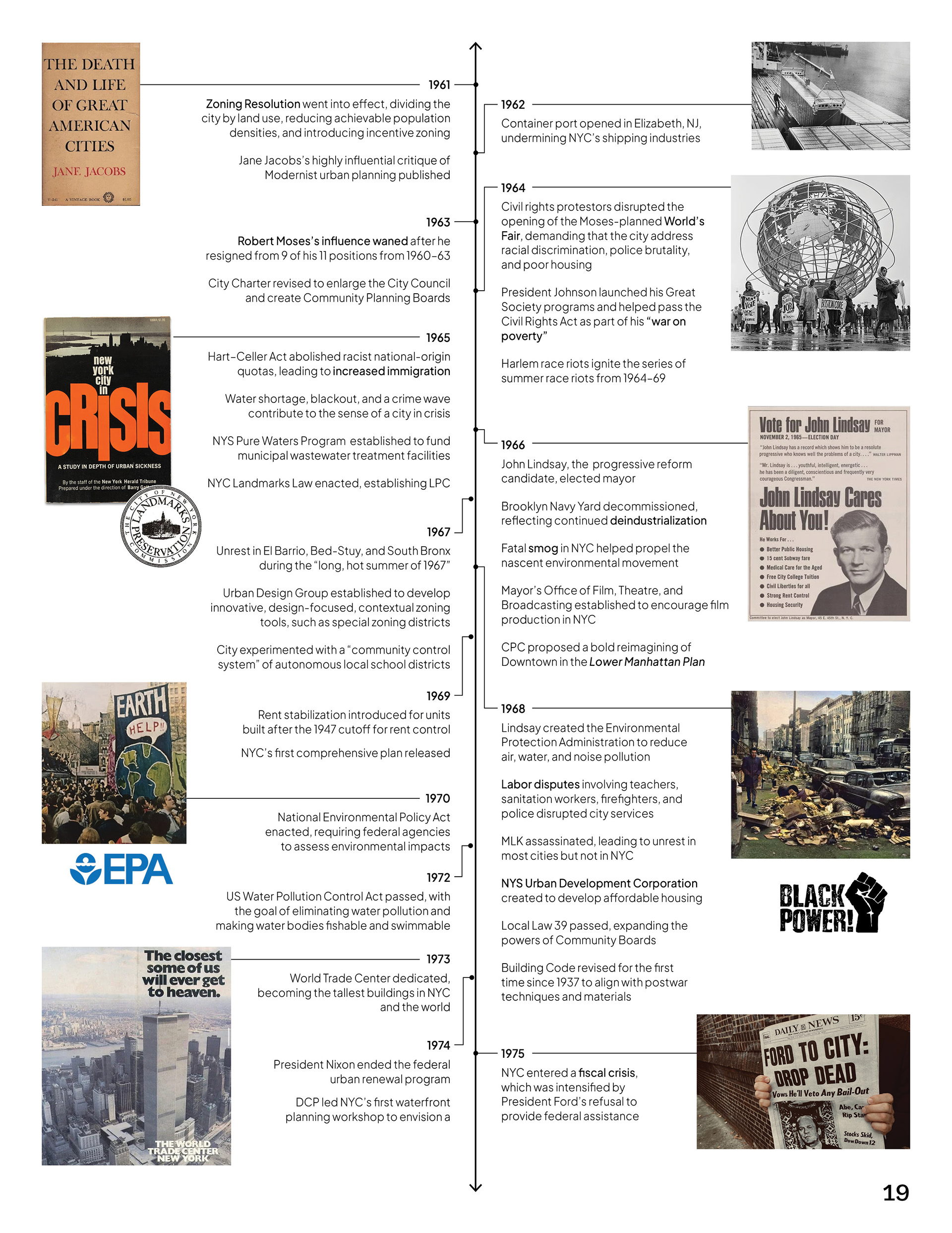 The project report includes a historic context examining a critical period of urban transformation in New York City between 1963 and 1975, when a confluence of forces — new zoning and land use policies, sweeping social and cultural changes, demographic and economic restructuring, evolving urban planning and architecture ideologies, and rising environmental awareness — dramatically reshaped the city. The city’s waterfront emerged as a particularly dynamic zone of transformation during this period. Once a hub of industrial maritime activity, the waterfront had fallen into decline as containerization, trucking, and automobile transport diminished the relevance of the city’s waterways as primary conduits for shipping and commerce.