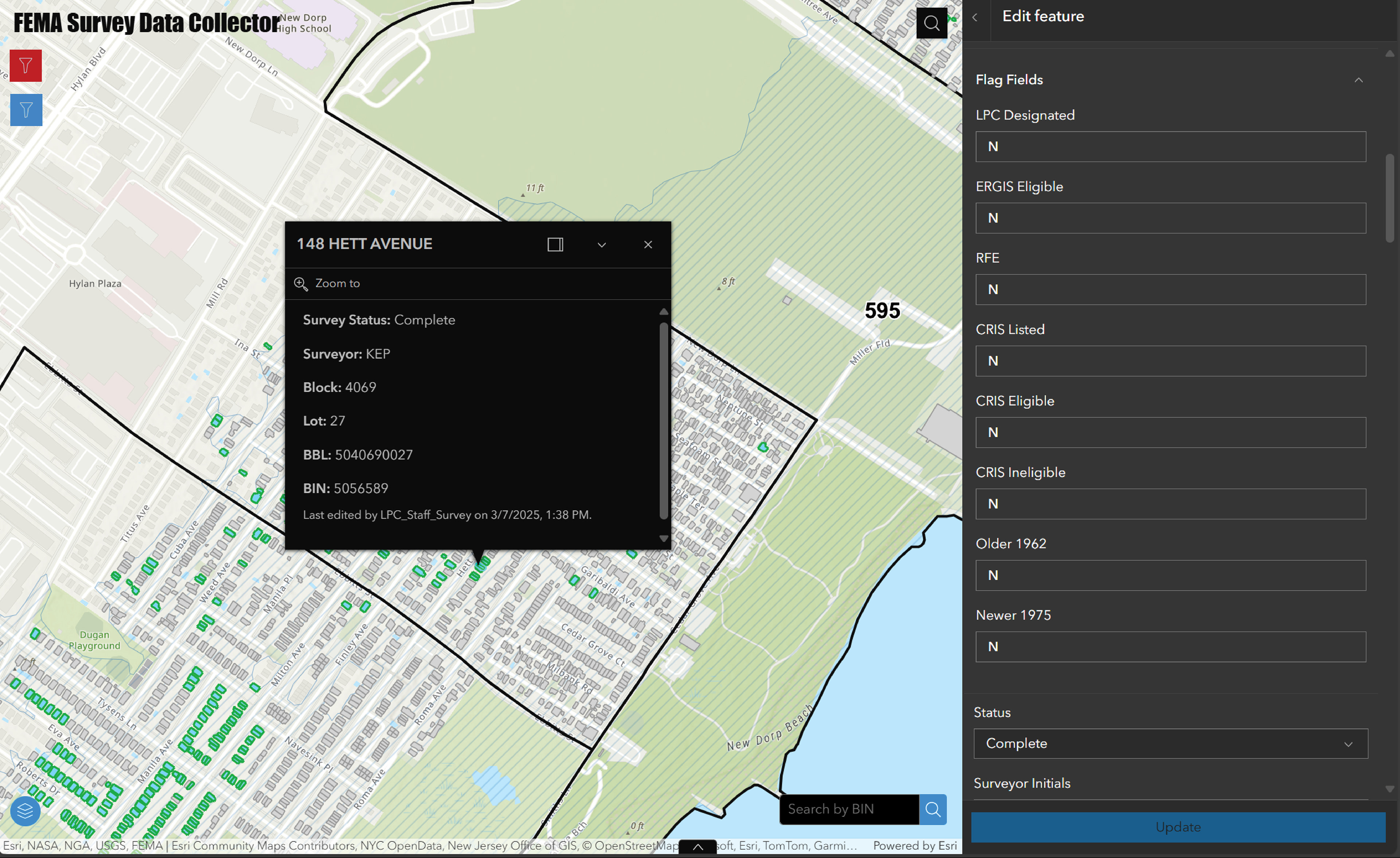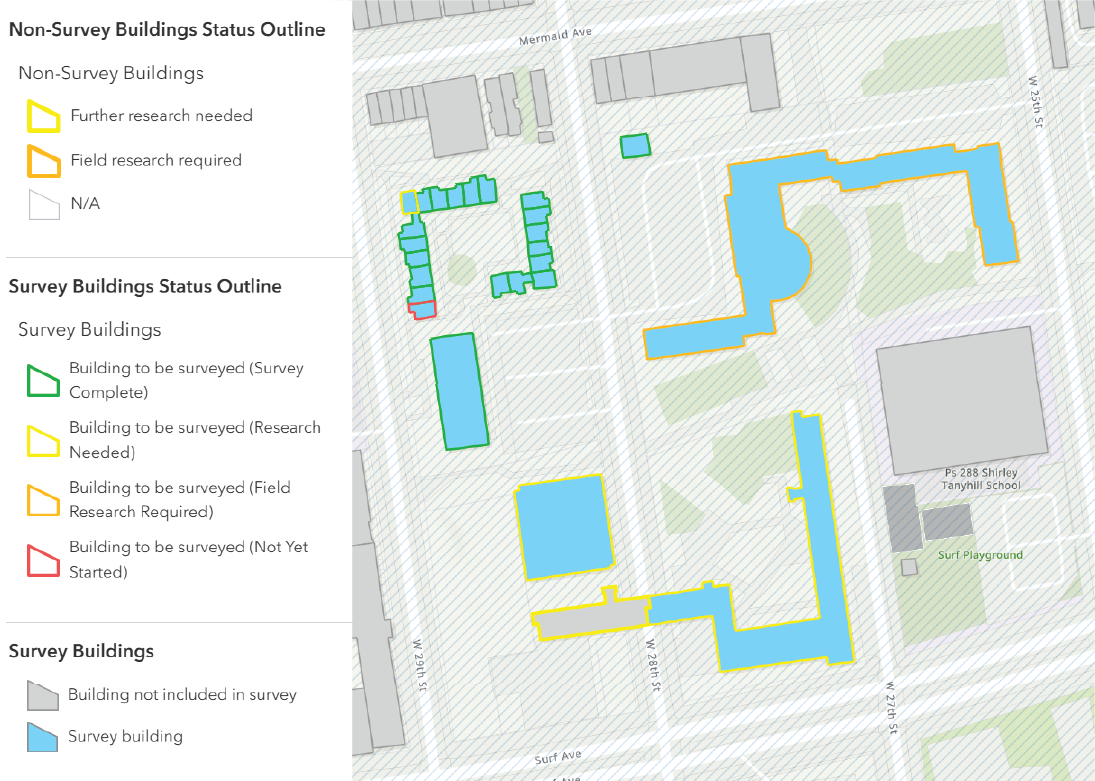 The surveyors used a custom ArcGIS map provided by the NYC LPC to collect survey data. The geodatabase included baseline land use and building information for the nearly 68,000 properties located within the survey area. In addition to the pre-populated fields, several fields were left empty for surveyors to complete, which included architectural descriptors, information on historical significance, and evaluations of integrity and S/NR eligibility.