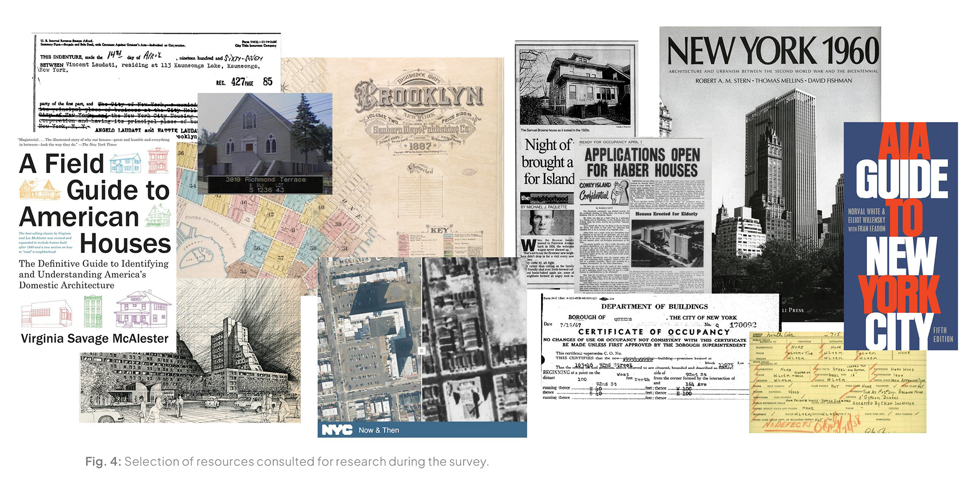 Surveyors conducted cursory research using various online resources to determine each property’s date of construction, architect, historic owner or occupants, and original use. The sources consulted included certificates of occupancy, deeds and conveyances, historic maps and atlases, newspaper articles, and various books, as well as data and reports from previous surveys.